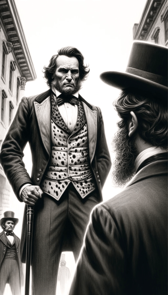 As Stanbery walked up the street, the hair on the back of his neck bristled at the sudden sound of footsteps approaching from behind. He whirled around, all at once face to face with a man he suspected must be the source of his trepidation: the former governor from Tennessee. Towering over six foot tall with a broad-shouldered muscular build, the man was dressed in a formal evening suit which framed a vest made from some type of spotted animal skin. Rugged features, thick sideburns, and an intense gaze conveyed a force to be reckoned with. As his brow furrowed, jaw clenched, and his lips pressed tightly together in a scowl, his fierce eyes burned with anger and indignation narrowing and fixating on Stanbery. The man was indeed in a savage mood.