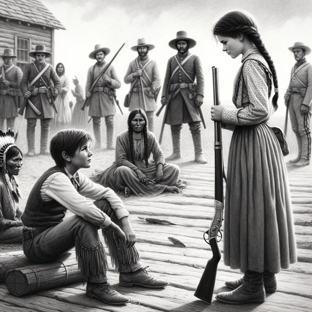 “Ma,” the girl said still holding the gun on the captain. “We can’t let them take Mingan Gray Wolf. He’s our friend; and the others—they’re his family.”